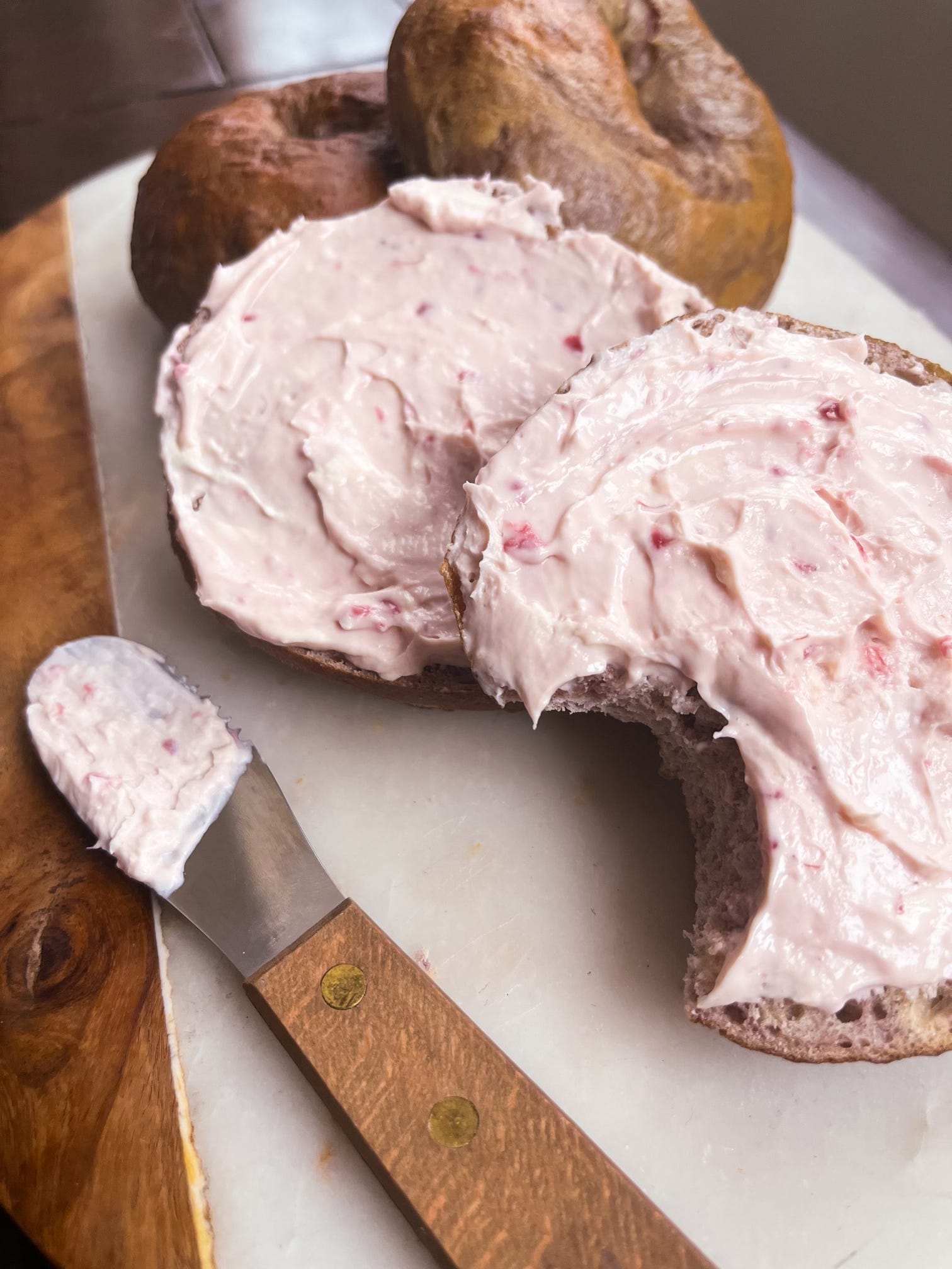 These are easy and adaptable sourdough bagels that have the perfect amount of chewiness. The raspberries add the right amount of sweetness and a bonus that they are beautiful.